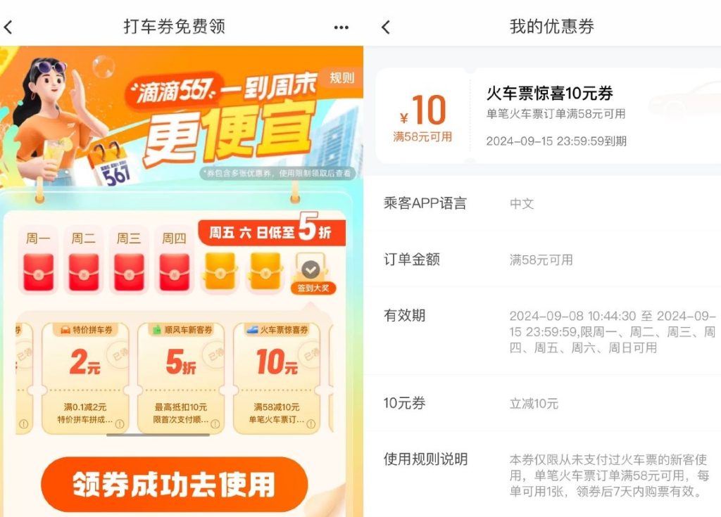 滴滴出行领58-10元火车票优惠券,直接进入活动地址,直接领取滴滴券包,其中包含火车票满58减10亓券,刚好要买火车票的还不错!